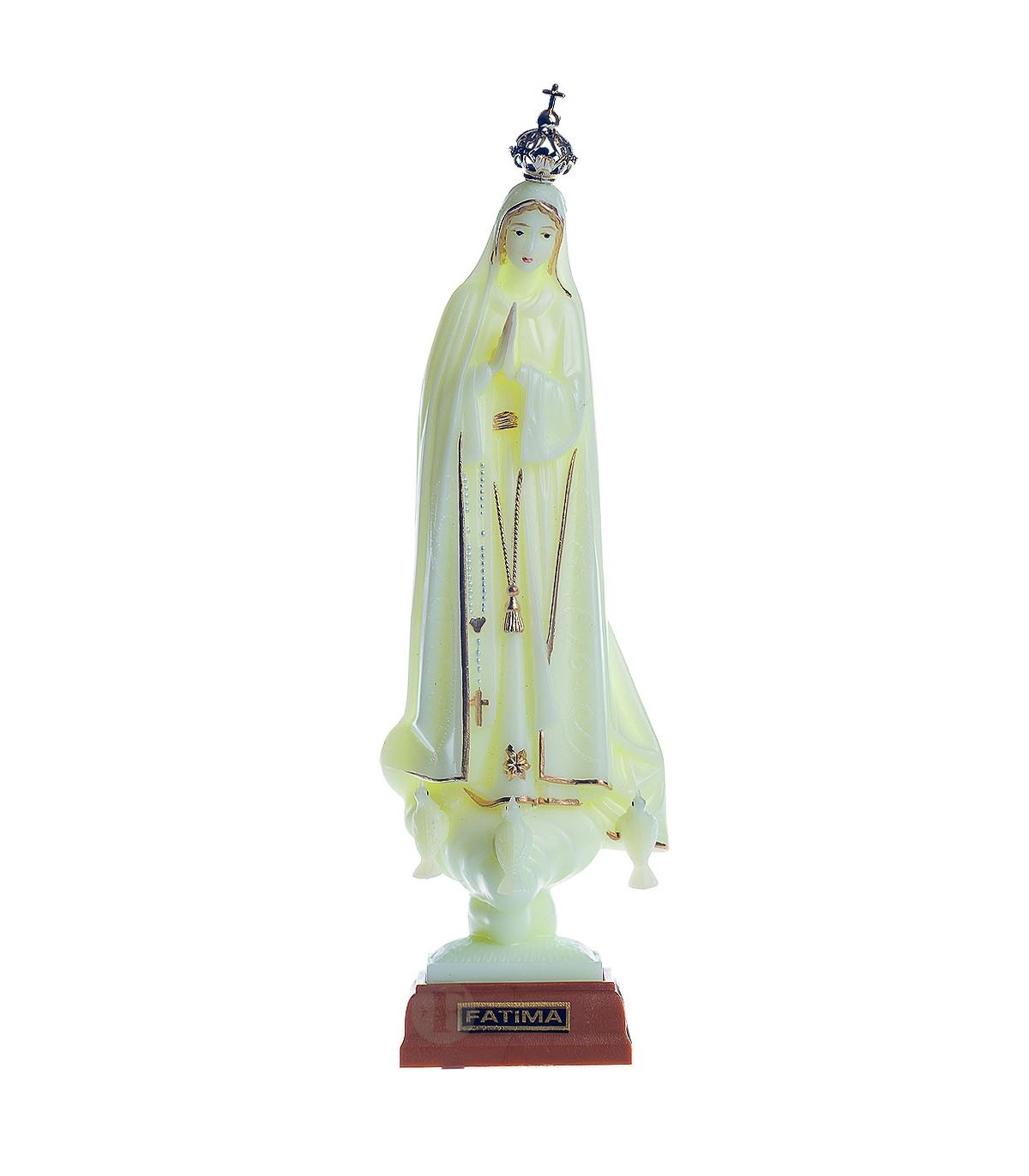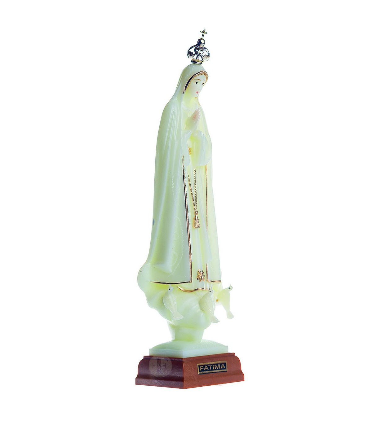 Our Lady of Fatima in recycled polystyrene with 18 cm in size. Bright with golden stripe.