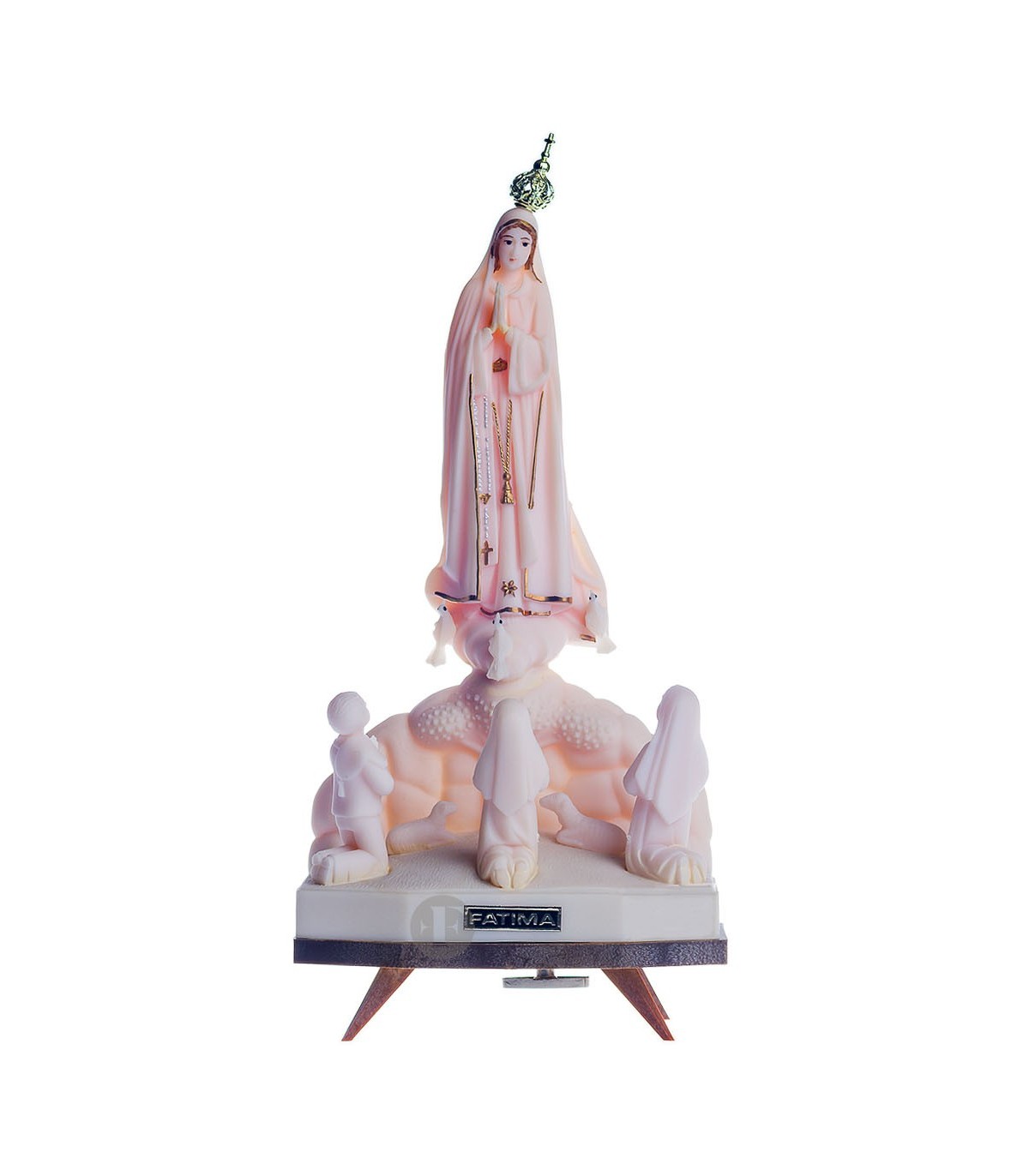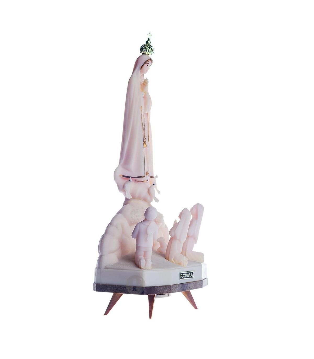 Aparição em poliestireno reciclado com 23 cm de tamanho. Imitação marfim com galão dourado. Com música. Totalmente pintada à mão.
