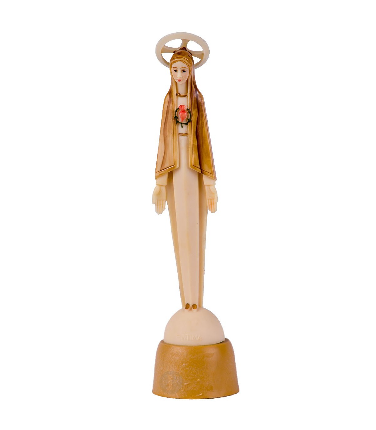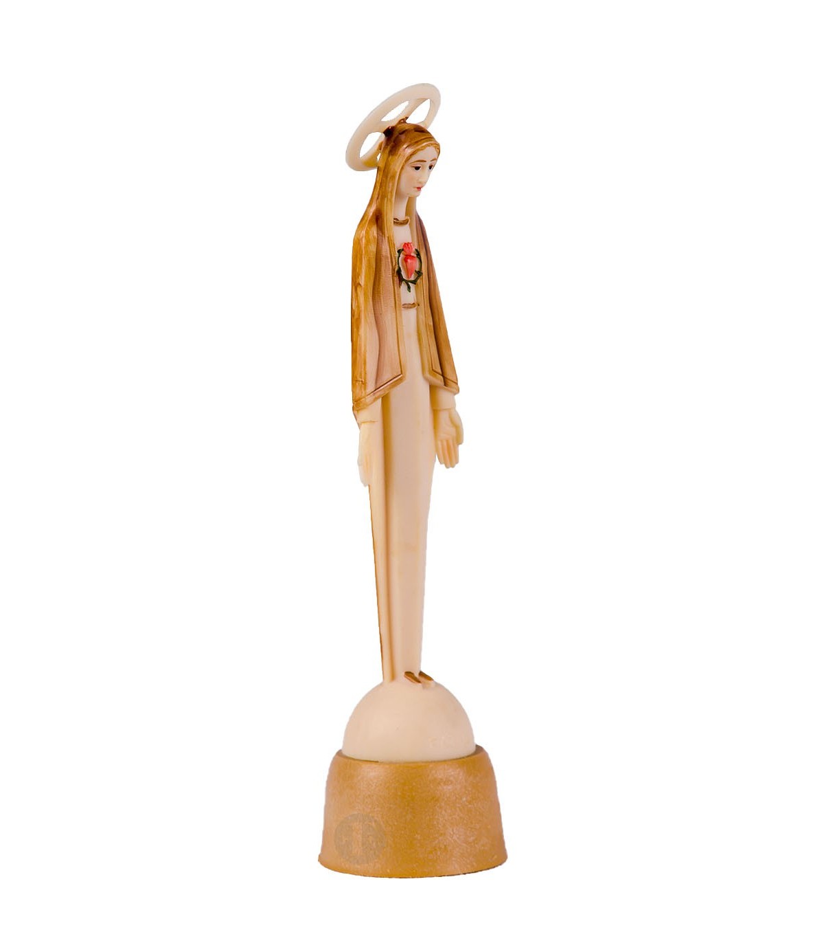 Imaculado Coração de Maria em poliestireno reciclado com 13 cm de tamanho, estilizado. Imitação de madeira. Totalmente pintado à mão.