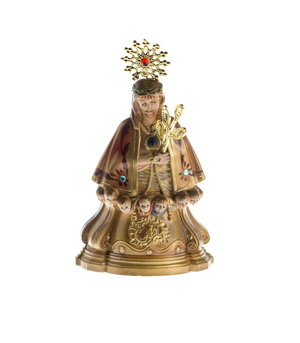 Senhor Santo Cristo em poliestireno reciclado com 12 cm de tamnaho. Pintura metalizada. Totalmente pintado à mão.