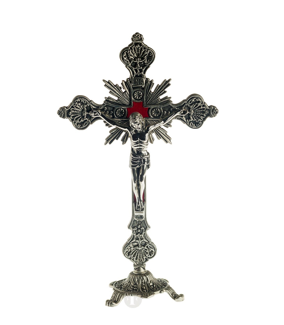 Crucifixo de Metal, Niquelado, com base, 23x13cm