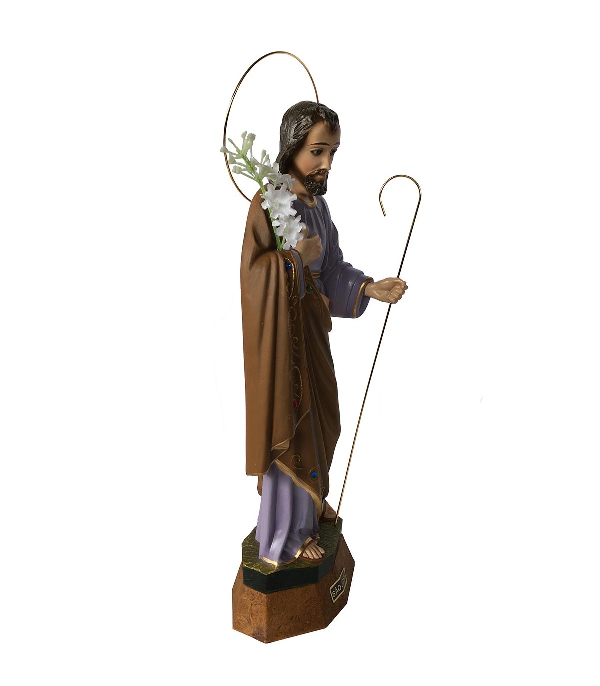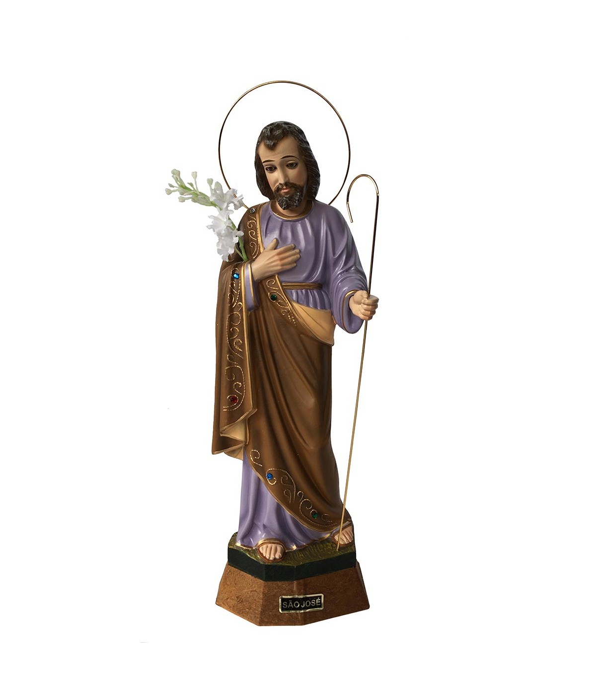 São José, com lírio, em poliestireno reciclado com 30 cm de tamanho e olhos de cristal. Pintura clássica. Totalmente pintado à mão.