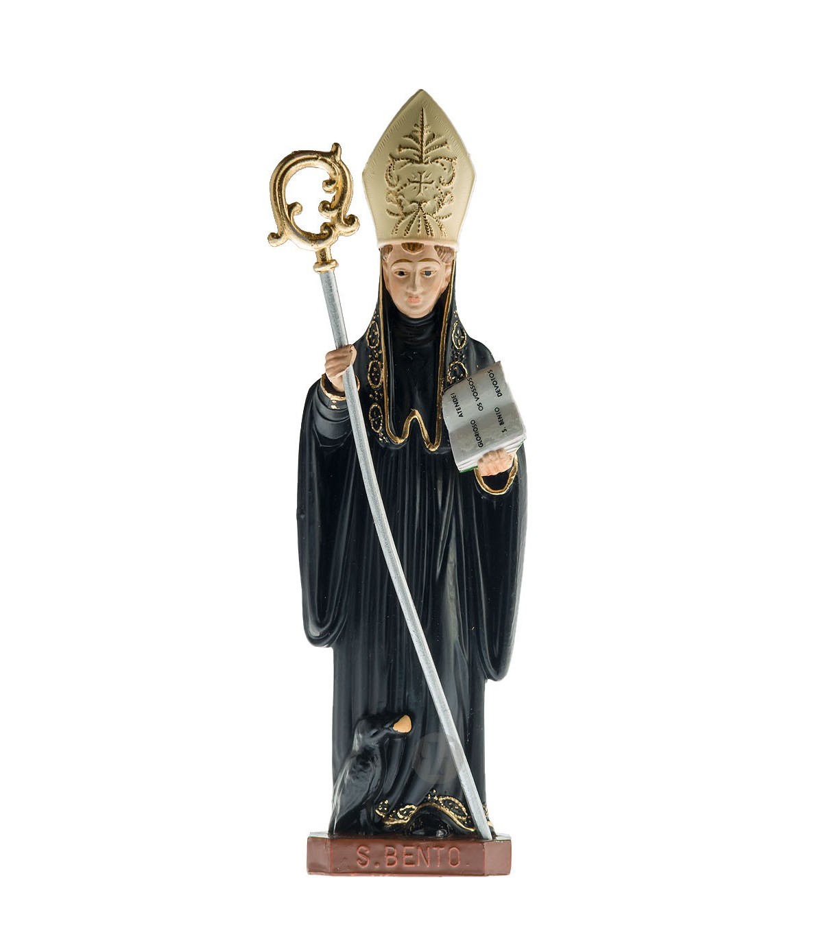 São Bento em poliestireno reciclado com 16 cm de tamanho. Pintura clássica, reprodução fiel do modelo original. Totalmente pintado à mão.
