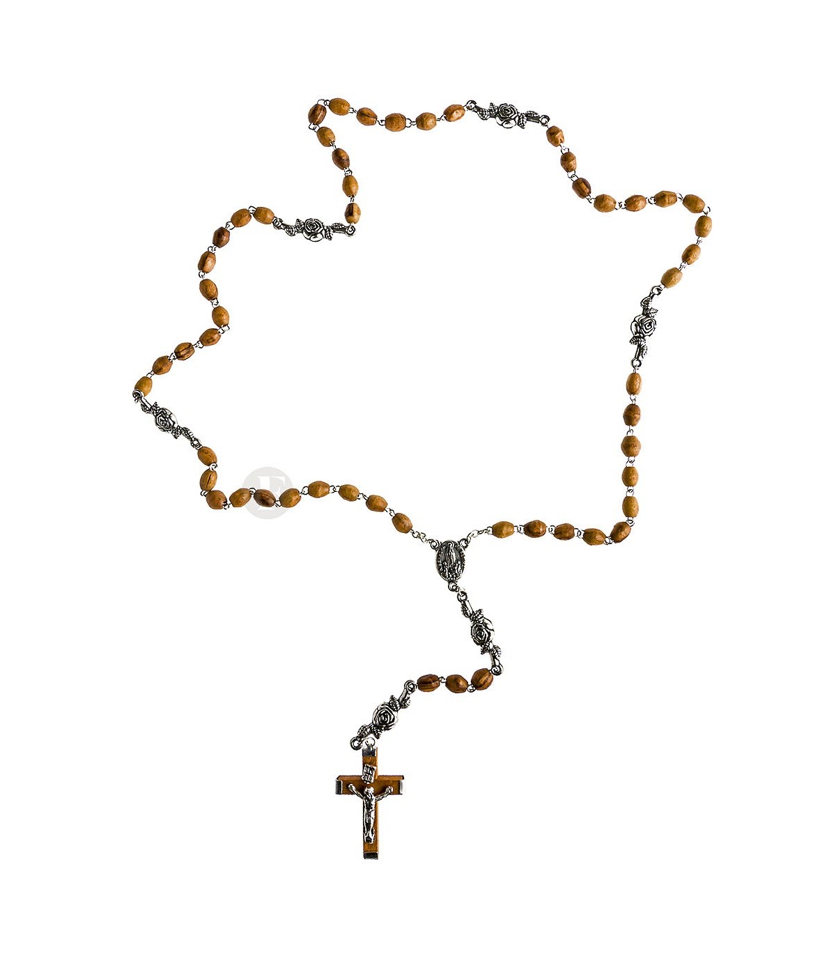Terço Madeira de Oliveira, com rosas, oval, 6/7 mm