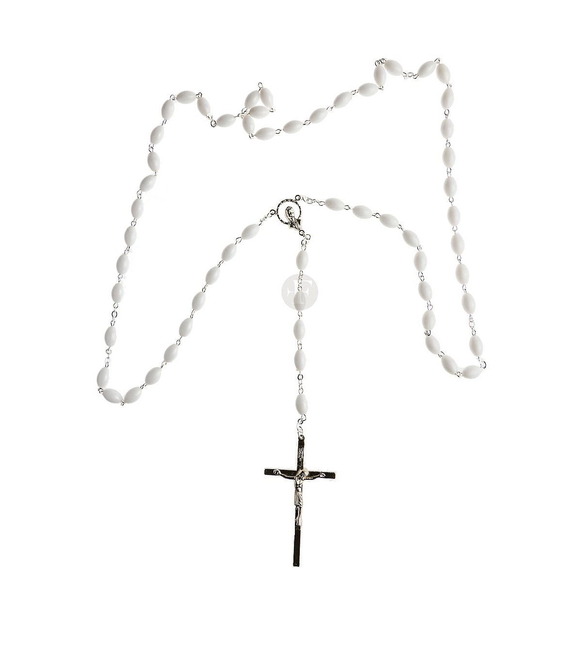 Terço de plástico, branco. Feito à mão. Contas ovais com 7/10 mm de tamanho.