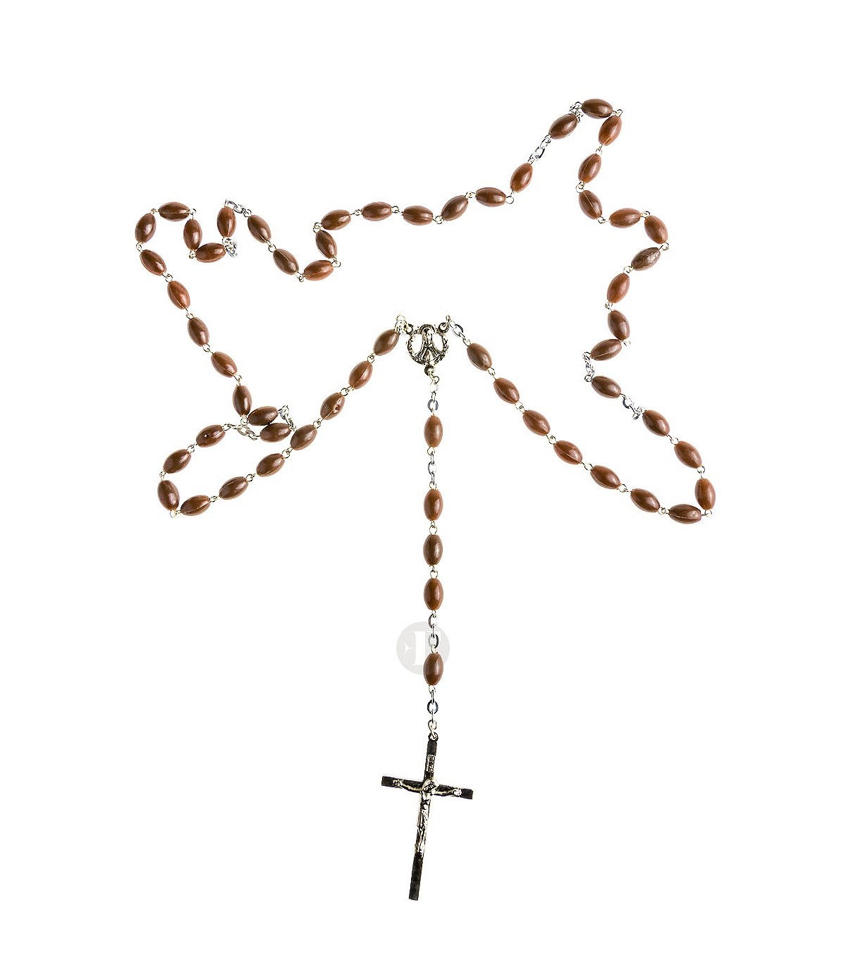 Terço de plástico, castanho. Feito à mão. Contas ovais com 7/10 mm de tamanho.