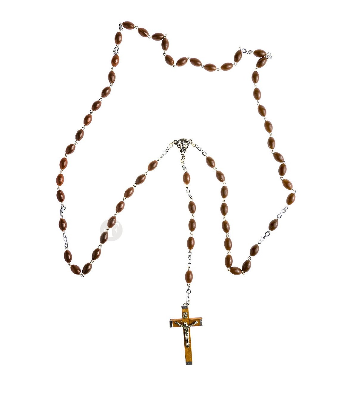 Terço de plástico, castanho com cruz de madeira. Feito à mão. Contas ovais com 7/10 mm de tamanho.