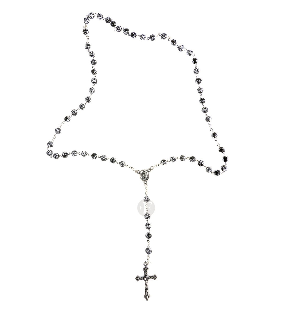 Terço de Plástico c/ Rosas Prateadas Preto, 6 mm